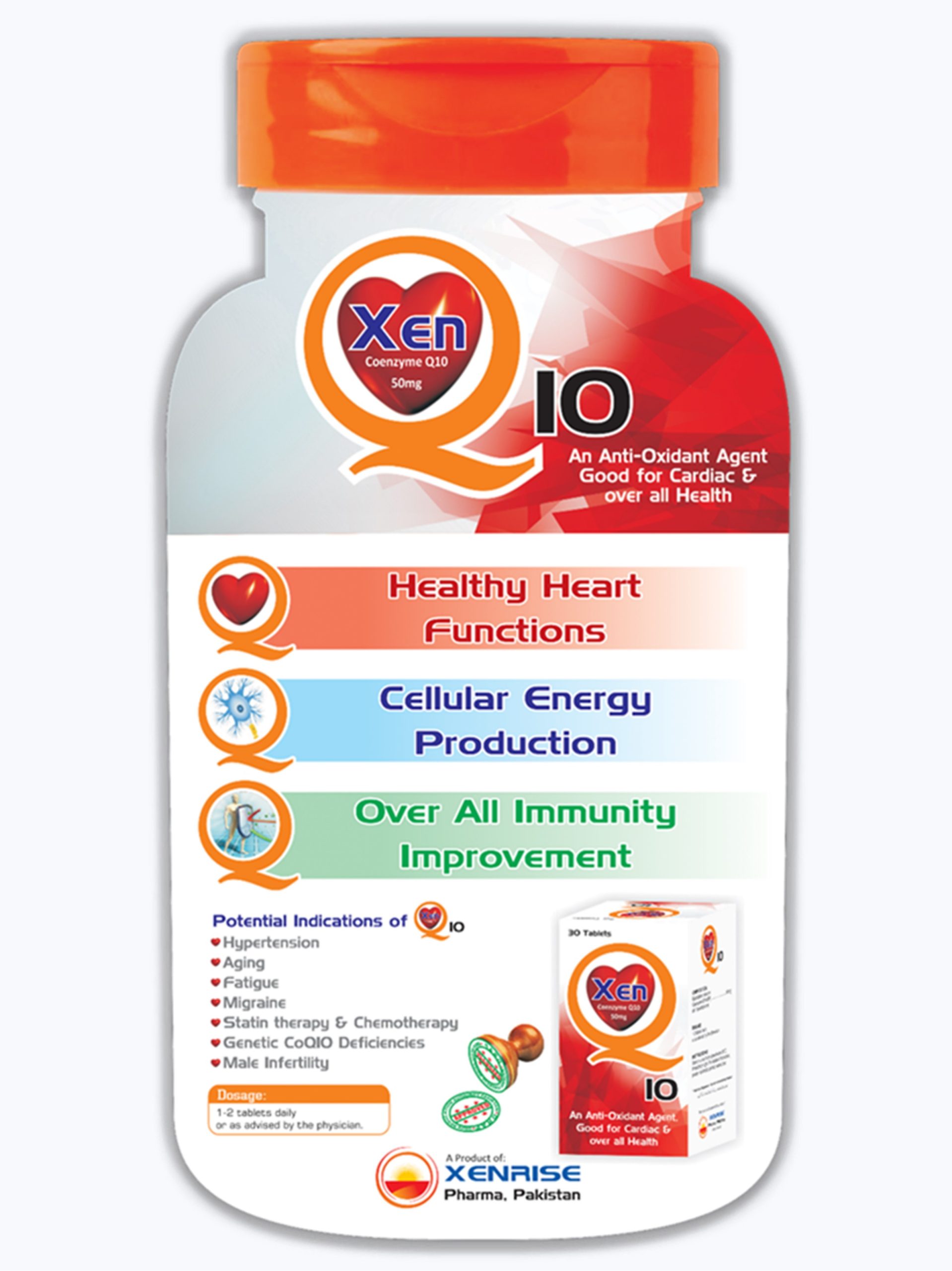 Xen-Q10 Tablet is a Dietary Supplement helps to maintain & support cardiovascular health. It boosts the energy level in human body. It helps in reducing the frequency of migraine, headache associated nausea and vomiting. It is an Antioxidant for the maintenance of good health. Xen-Q10 Tablets help enzymes to work to digest food and to perform other processes of body. They help to protect the heart & skeletal muscles.